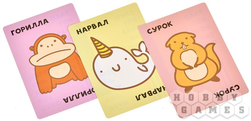 В этой игре вам придется выкладывать на стол карты, произнося вслух слова "тако, кот, коза, сыр, пицца", вне зависимости от того, что будет изображено и написано на картах. А также нужно будет делать определенные действия, если в игре появились особые карты: горилла, сурок или нарвал.