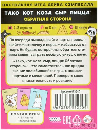 И также стоит упомянуть, что это самостоятельная игра, но можно смешать её с базовой версией "Тако кота", чтобы увеличить продолжительность партии, количество игроков, веселья и забавной неразберихи.