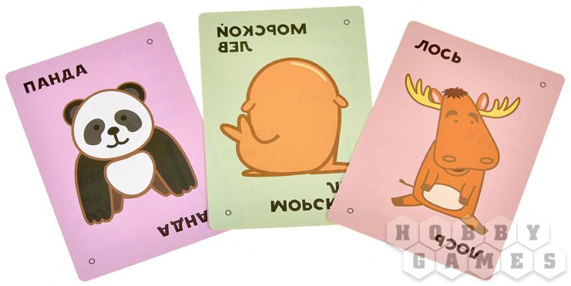 Что же нового принесла нам именно эта коробка? Тут вы не найдёте, как в прошлый раз, сурка, гориллу и рогатого нарвала. Вместо них в колоде с картами притаились новые герои: панда, лось и морской лев! В тот момент, когда открывается карта с таким персонажем, нужно перед тем, как накрыть колоду, сделать определённый жест руками, например, погладить себя по животу, изобразить рога над головой или хлопнуть два раза в ладоши.