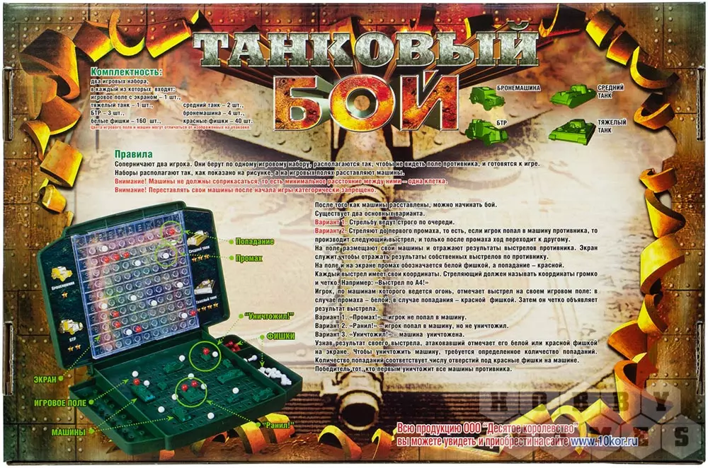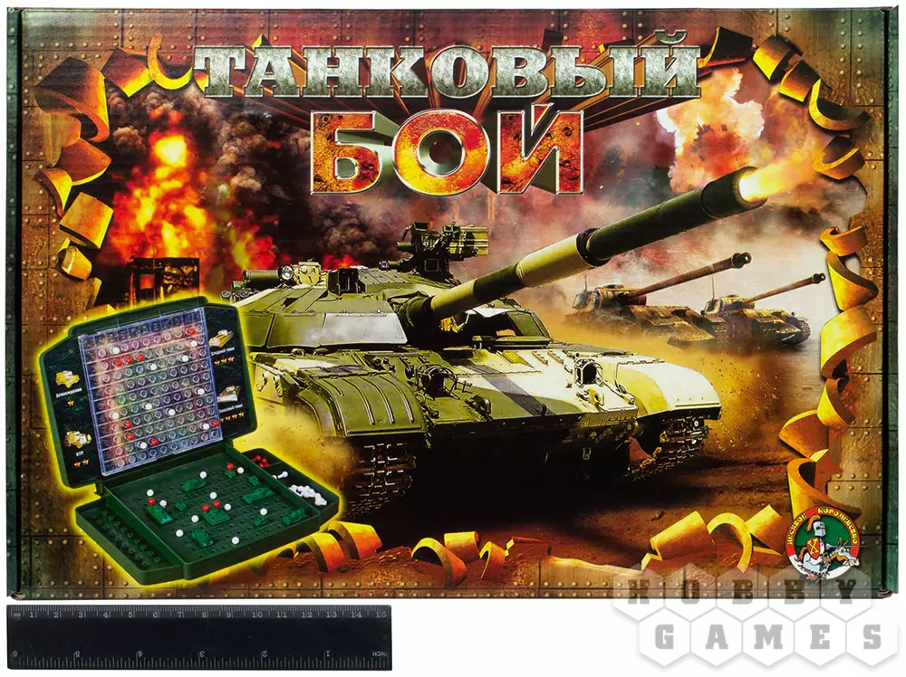 "Танковый бой" – это аналог морского боя, чьё единственное отличие от оригинала – танки вместо кораблей. 2 игровых поля и 20 фигурок военной техники позволят наслаждаться игрой без необходимости чертить поле битвы самостоятельно. Играйте столько, сколько вам захочется!