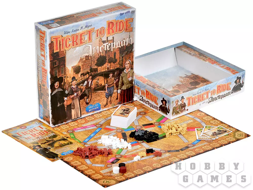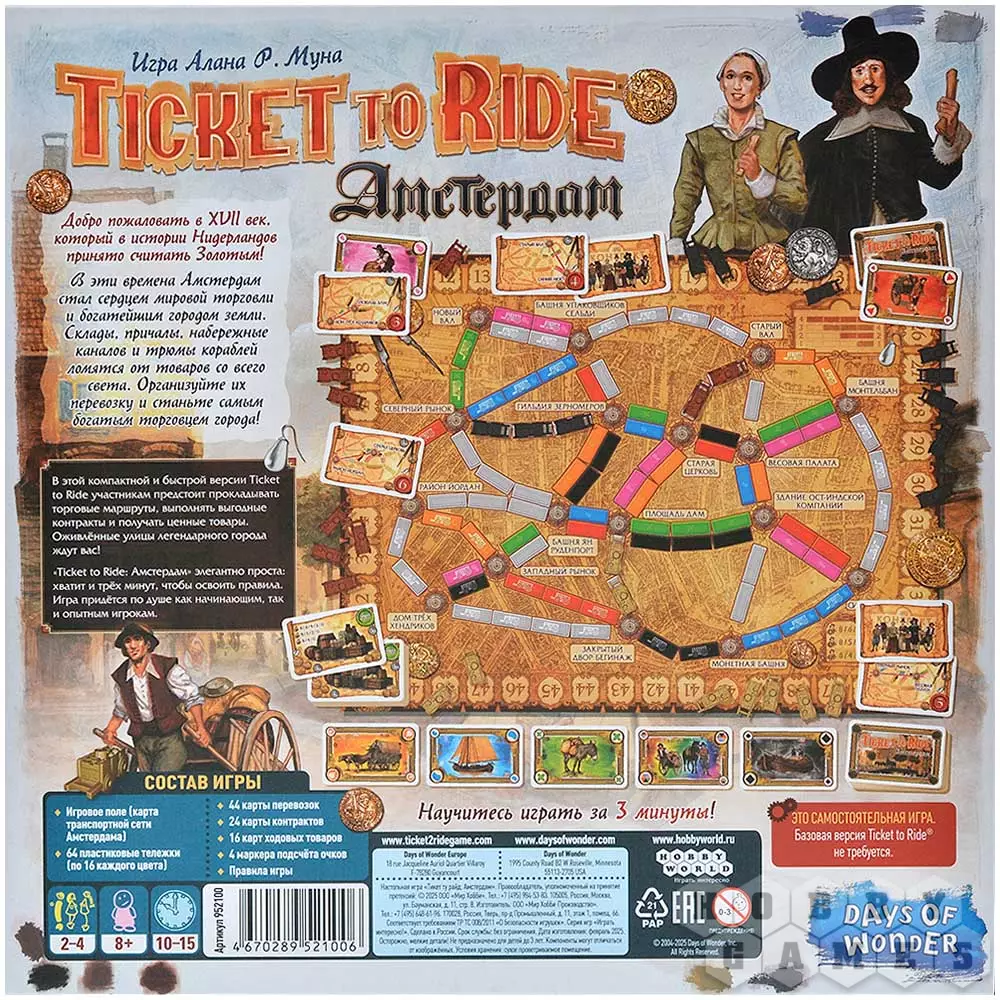 "Ticket to Ride: Амстердам" – это динамичная и компактная настольная игра из любимой многими серии, где вы окажетесь в самом сердце Нидерландов во времена торгового бума XVII века! Как и всегда, ваша цель – прокладывать маршруты, охотиться за выгодными контрактами и, как следствие, приобретать ценные товары, наполняя свои склады сокровищами со всего света. Игра сочетает в себе приятную стратегию и лёгкость освоения, ведь чтобы понять правила, вам хватит всего несколько минут! Благодаря этому "Амстердам" будет интересен как новичкам, так и опытным игрокам, а также прекрасно подойдёт как для дружеских партий, так и для семейных вечеров. Погружайтесь в атмосферу Золотого века, опережайте соперников и отправляйтесь в увлекательное путешествие, в конце которого вас ждут богатства и слава!