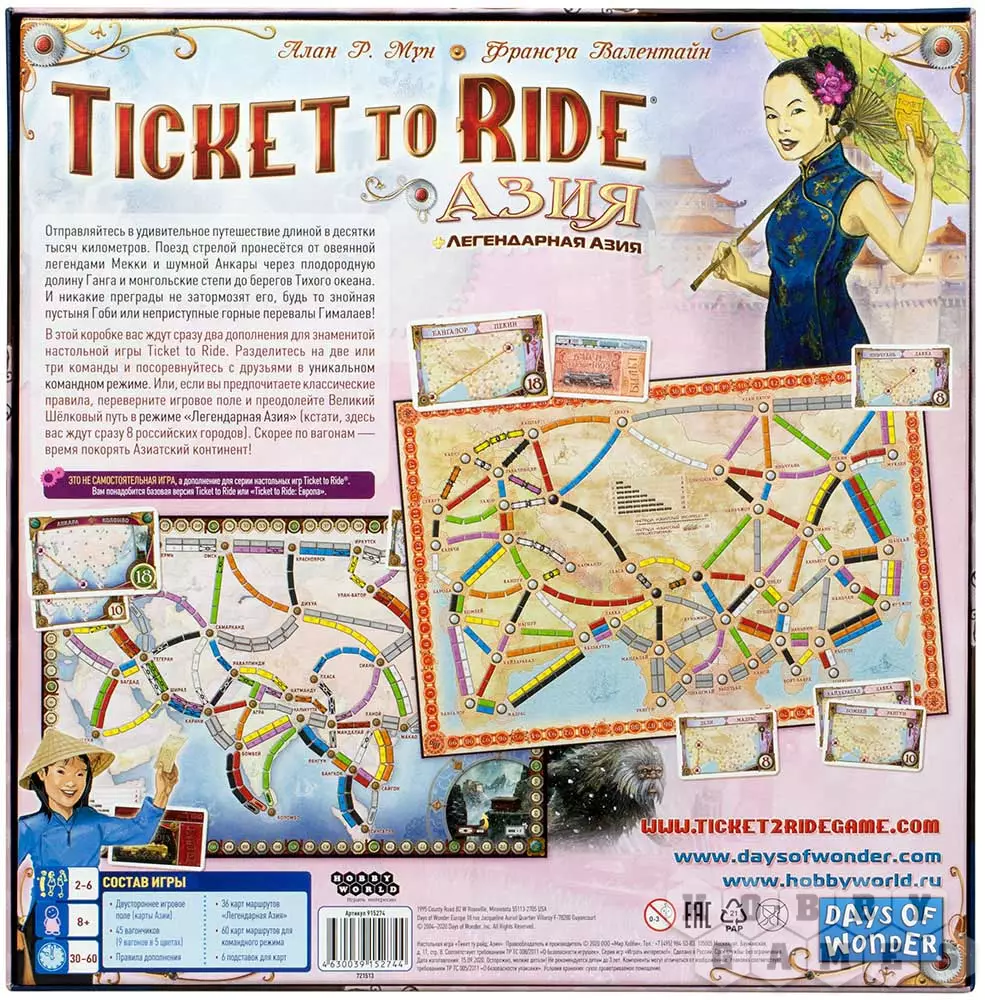 Синицына06.03.2021 16:39Очень любим Билет на поезд, но разнообразие никто не отменял. Поэтому Азия отличный вариант (специально делали предзаказ), который содержит целых две новые карты: Легендарная Азия, которая хороша тем, что партии протекают быстрее (для любителей отыгрываться), идеально подойдет для игры вдвоем+душу греет наличие на карте российских городов) Карта Азия же позволяет добавить в игру шестого человека и тренирует командную игру. -