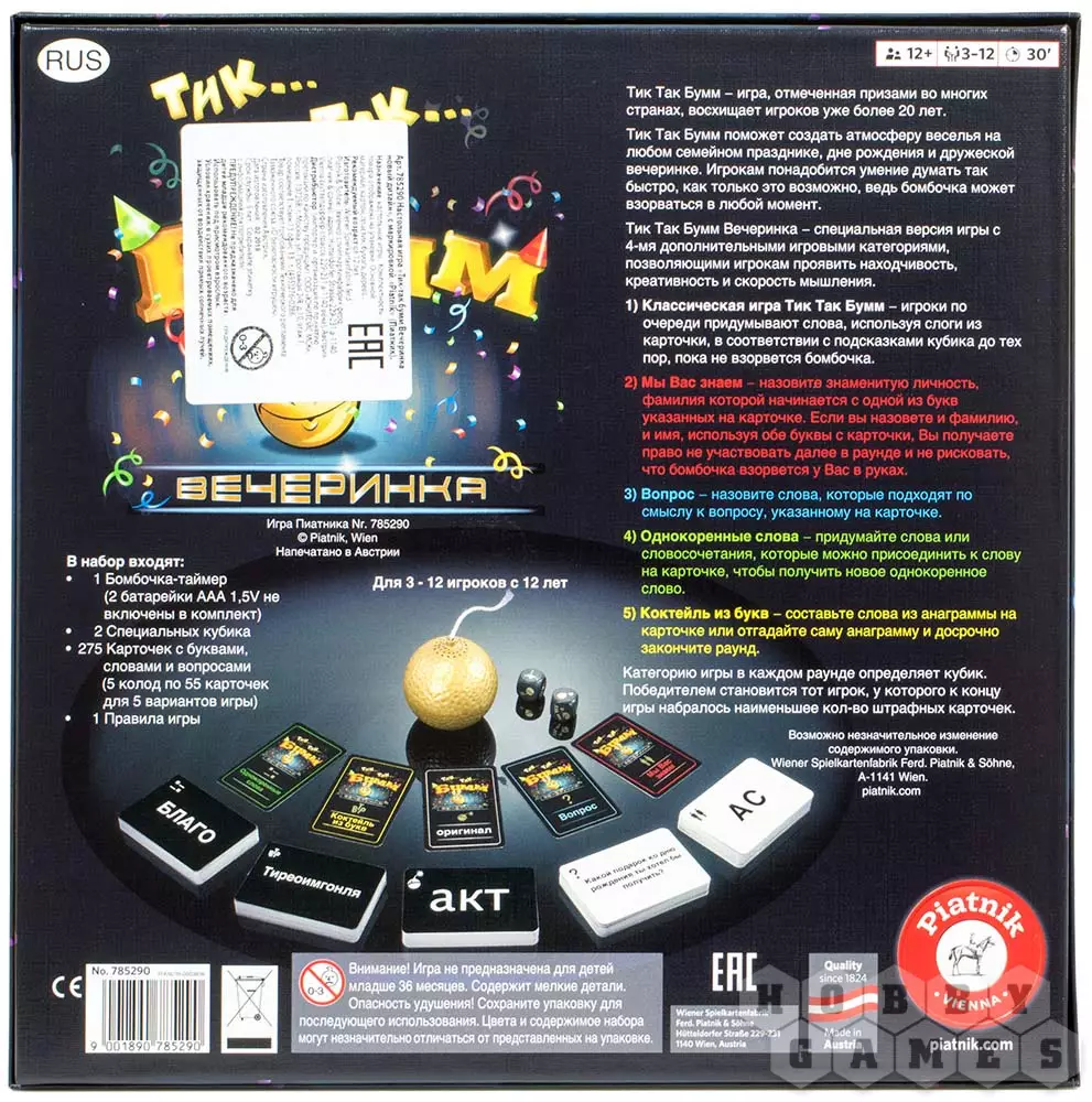 Настольная игра "Тик-так Бумм" широко известна среди игроков разного возраста, она получила престижную награду в 1996 году как лучшая семейная игра, но радует игроков по всему миру и по сей день! В этой специальной версии игры – "Вечеринка" – игра становится ещё более увлекательной и интересной!