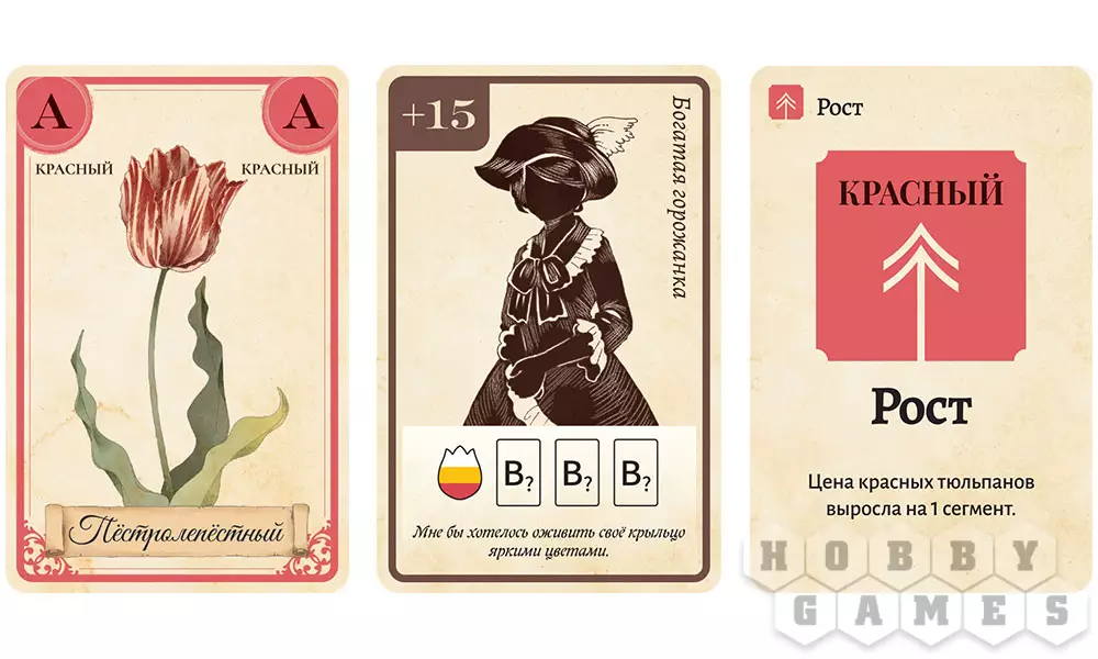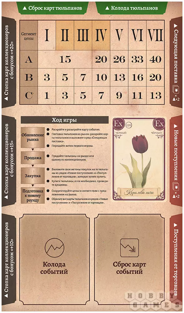 В фазе обновления рынка открывается карта события, корректирующая цены на тюльпаны, и проверяется выполнение условий конца игры. Если игра продолжается, рынок восполняется новыми картами тюльпанов, а жетон первого игрока передаётся дальше по часовой стрелке. После этого наступает фаза продаж, в которой игроки по очереди продают свои тюльпаны на рынке или коллекционерам. Далее происходит фаза закупки: игроки в порядке ходя выкладывают жетоны покупок на карты тюльпанов, которые хотят приобрести. Если на один тюльпан есть более одного покупателя, происходит аукцион: начиная с первого, все участники аукциона должны либо сделать ставку, либо спасовать. Начальная ставка должна быть выше рыночной, а каждая последующая – выше предыдущей. Если все участники торгов, кроме одного, спасовали, оставшийся должен выкупить тюльпан по его рыночной стоимости. После закупок наступает последняя фаза – подготовка к новому раунду: в этой фазе цены на тюльпаны изменяются в зависимости от количества оставшихся на рынке тюльпанов каждого цвета, после чего непроданные тюльпаны уходят в сброс. Посчитайте отдельно карты тюльпанов каждого цвета. Фишку цены того цвета, которого осталось больше, сдвиньте влево, а фишку цены цвета, которого осталось меньше, сдвиньте вправо. После этого начинается фаза обновления рынка следующего раунда.