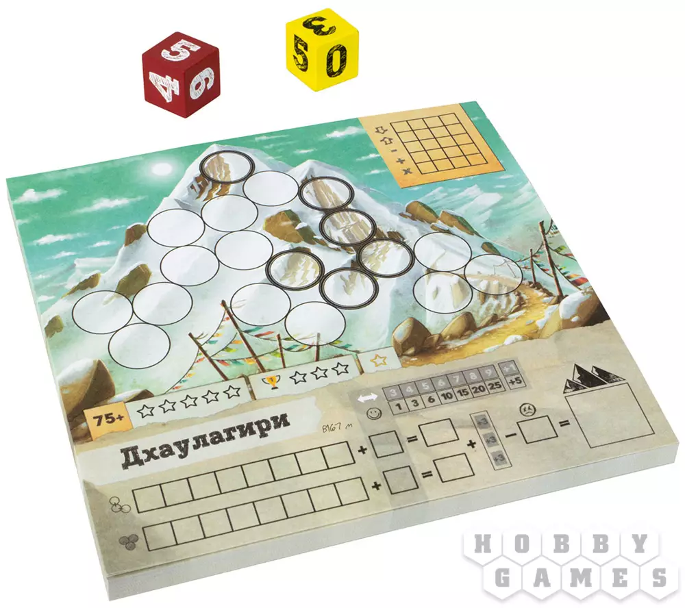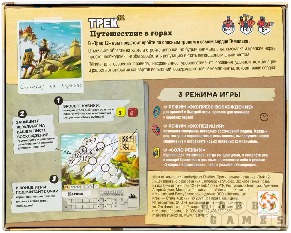 В настольной игре "Трек 12: Гималаи" вам предстоит совершить подъём в горы. Или спуск. Маршрут вы вольны выбирать какой вздумается, ведь главной целью игры будет пройти маршрут лучше всех и набрать как можно больше очков. А чем больше участников, тем сложнее это сделать, ведь играть можно компанией до 50 человек! Механика игры представляет собой roll'n'write, по-русски "брось и пиши": вы будете бросать 2 игральных кубика, а полученные результаты записывать в свой лист маршрута. Кстати о маршруте: он состоит из 19 пустых ячеек, расположенных рядом друг с другом. Чтобы получить победные очки, вам предстоит строить цепочки (числа в соседних ячейках должны идти по порядку) и области (в соседних ячейках должны быть одинаковые числа). Чем длиннее цепочки и больше области, тем больше победных очков они принесут вам в конце игры. Бросив кубики, вы можете выбрать и вписать один из 5 результатов:
