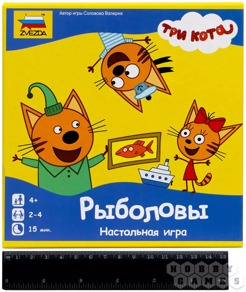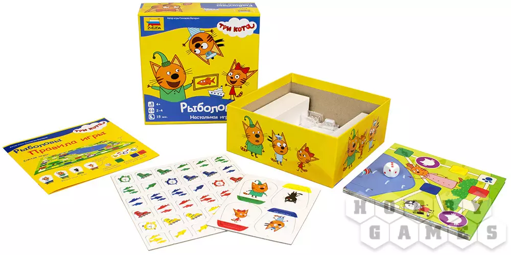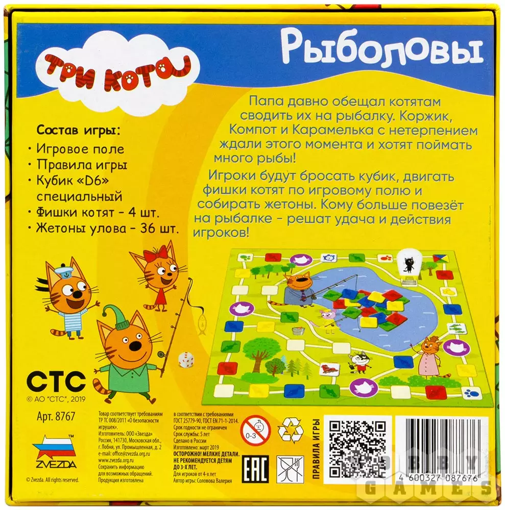 В настольной игре "Три кота. Рыболовы" игроки отправляются на рыбалку к озеру, чтобы принести домой самый большой улов. Механика простая – бросайте кубики и перемещайте своего котёнка на выпавшее число шагов и подбирайте фишку с уловом.