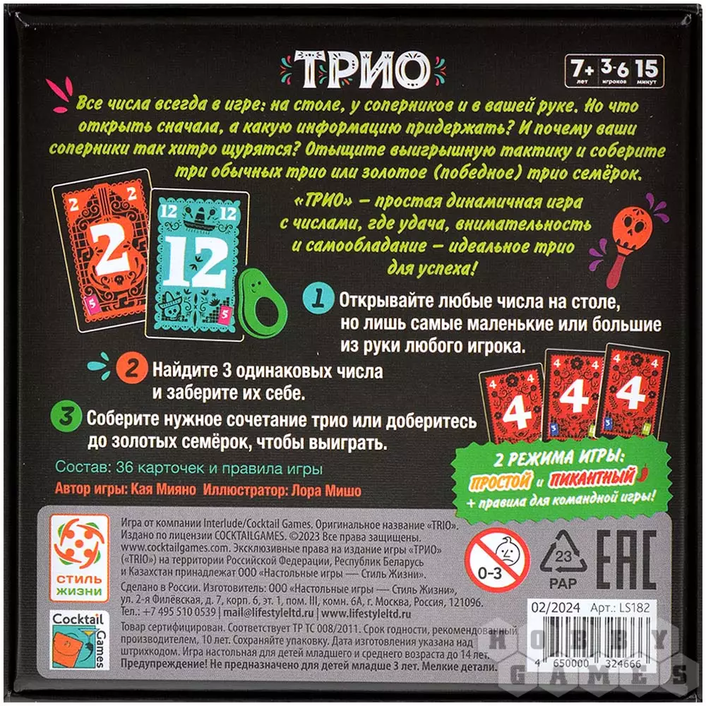 Каждый игрок получает определённое количество карт, не показывая другим, а остальные выкладываются в закрытую в центре стола. Карты на руке должны быть отсортированы по возрастания слева направо, то есть в левой части руки у вас будет самая маленькая цифра, а в правой – самая большая. Чтобы победить, нужно собрать 3 тройки любых одинаковых цифр или одну золотую тройку – семёрки! Для этого в свой ход вы будете открывать карты по одной. Главное правило здесь – все карты всегда в игре: и на столе, и у вас на руке, и на руках у противников. Это значит, что можно открывать карты откуда угодно – на столе, в вашей руке и на руках противника. НО! С руки можно выложить только самую маленькую или самую большую цифру. Ход игрока заканчивается, если открываются 3 одинаковых или 2 разных карты. В первом случае тройка отправляется стопкой на стол перед игроком, а во втором – карты возвращаются в исходное положение.