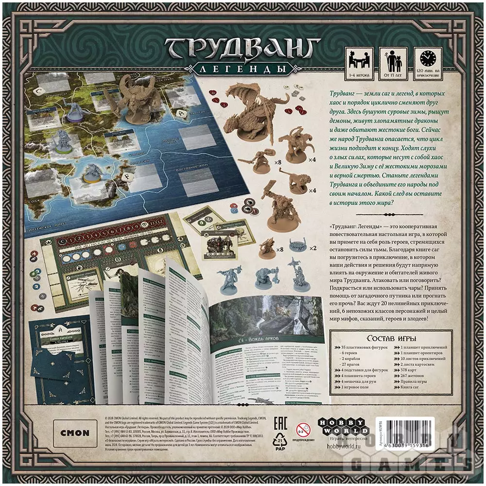 Отправьтесь в кооперативное приключение в настольной игре "Трудванг: Легенды"! Пришло время стать отважными героями, что борются со злом, и оставить собственный след в летописях этого мира. Откройте книгу саг, чтобы начать вашу историю! Как вы поступите в случае угрозы: сразу пойдёте в атаку или попробуете поговорить? Спланируете скрытую атаку или обрушите на врага мощь всего своего магического арсенала? Какие бы решения вы ни приняли, они повлекут за собой последствия, которые обязательно отразятся не только на окружающем вас мире, но и на его обитателях. У вас впереди 20 нелинейных приключений, 6 совершенно уникальных классов героев и огромный мир сказаний, мифов и легенд. Станьте их частью и напишите собственную сагу в мире Трудванга!