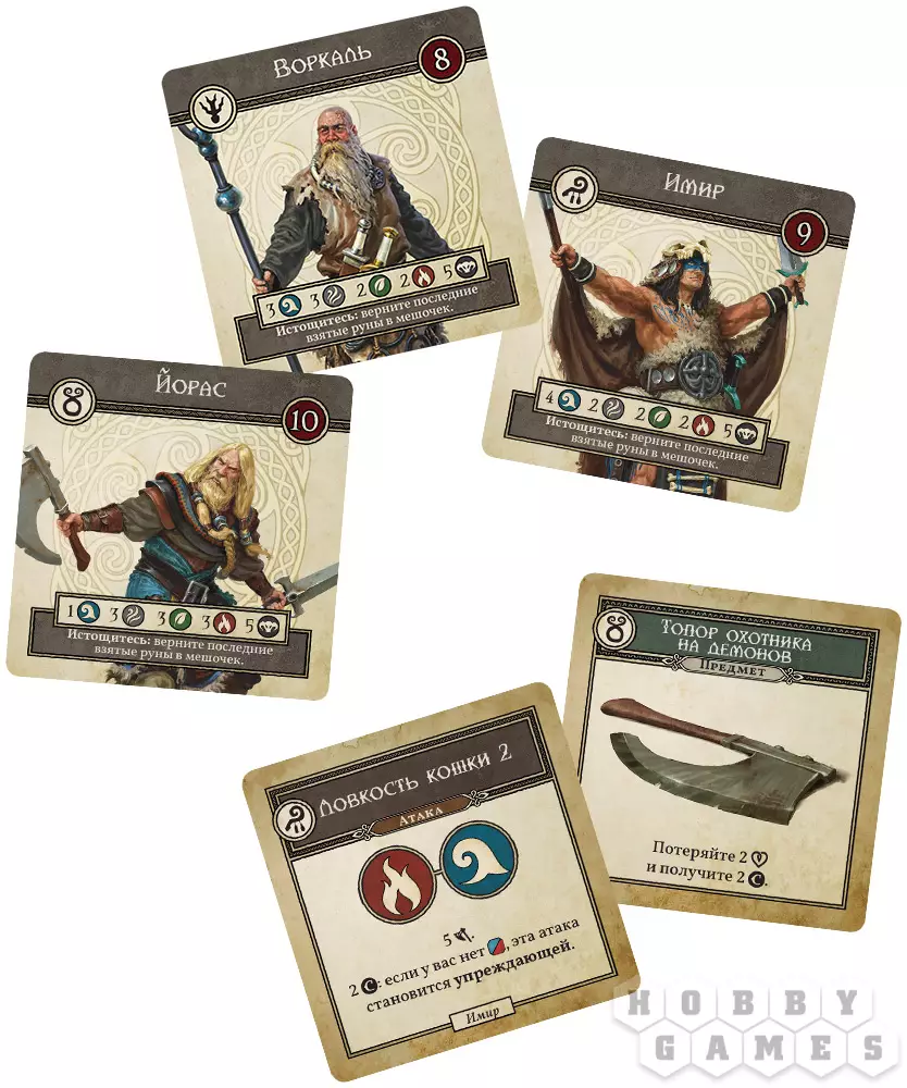В первую фазу каждый герой может отправиться в соседние земли, чтобы исследовать их. Тут надо быть осторожным: если в покидаемом регионе есть враги, не относящиеся к ориентиру, они наносят герою по одному урону. Куда отправиться? Это вам будет подсказывать книга саг. А каким маршрутом добираться до конечной точки, решать уже вам: пойдёте ли вы из Эйдленда в Дикоземье напрямик сквозь Ледяную гряду, или решите обогнуть горы на корабле через Мрачное море?