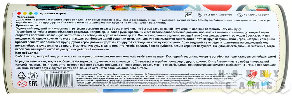 Особенность этой версии Твистера – тубус, в который легко упаковать игровое поле. Благодаря этому игровое поле будет защищено от любых невзгод и его можно брать с собой куда угодно: в дорогу, на пикник или в гости к друзьям и даже в поход!