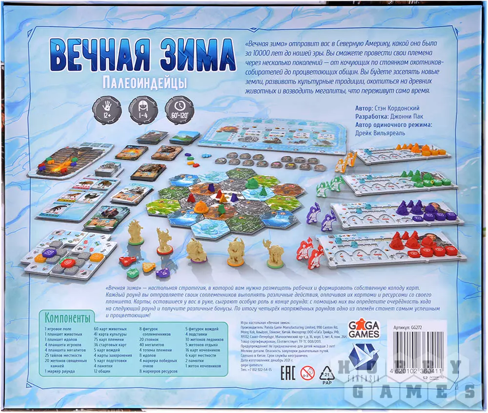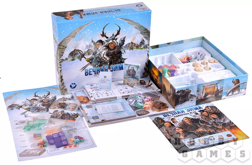 Игра отличается обилием искусно переплетённых друг с другом механик. Здесь и размещение рабочих, и построение колоды, и контроль территорий, и менеджмент ресурсов, и даже головоломка! Все они изящно вплетены в повествование, рассказывая историю о нелёгком быте палеоиндейцев: вам предстоит заниматься охотой на мамонтов, разбивать лагеря и кочевать в поисках плодородных земель, возводить мегалиты и молиться идолам, чтобы злой рок обошёл племя стороной… Придётся просчитывать действия наперёд и распределять силы – но не выйдет ограничиться одной тактикой и прийти к победе по проторенной дорожке. Каждый ход обстановка меняется, вынуждая принимать сложные решения, и приближается солнечное затмение, что даст бонусы и определит новый порядок хода. В "Вечной зиме" переплелись конфликтность и вдумчивый игровой процесс, присущий евро-играм – борьба за место под солнцем обещает быть сложной и интригующей до самого конца!