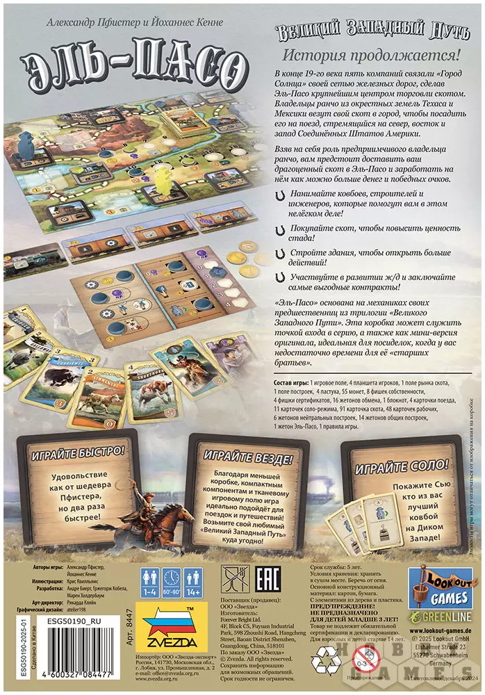 "Великий Западный Путь. Эль-Пасо" – это увлекательная стратегическая игра, в которой вам предстоит управлять ранчо, нанимать работников, строить здания и развивать железнодорожную сеть. Главная цель – доставить скот в Эль-Пасо, получить за него наибольшую прибыль и оставить конкурентов позади. Игра подойдёт как опытным любителям настольных стратегий, так и новичкам, ведь "Эль-Пасо" – более компактная версия игр из оригинальной серии, идеально подходящая для быстрых партий. Готовы испытать свою удачу и стратегическое мастерство? Дерзайте!