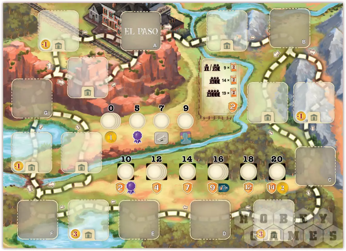 Этап движения позволит вам переместить пастуха по пути на одну или несколько локаций, в зависимости от лимита шагов на планшете. Локации с жетонами – это места, где можно выполнить различные действия. Важно помнить, что на первом ходу можно выбрать любой жетон нейтральной постройки. Когда пастух достигнет Эль-Пасо, его движение завершится, и вы должны будете выполнить все действия, связанные с этим городом.