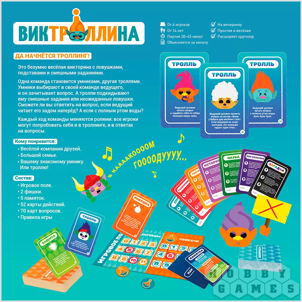 "Виктроллина" – это веселая вечериночная настолка с простыми правилами, которая отлично подойдёт для большой компании. Игрокам нужно будет разделиться на две команды, одна из которых будет заниматься ответами на вопросы, а другая – мешать им, троллить и всячески хулиганить.