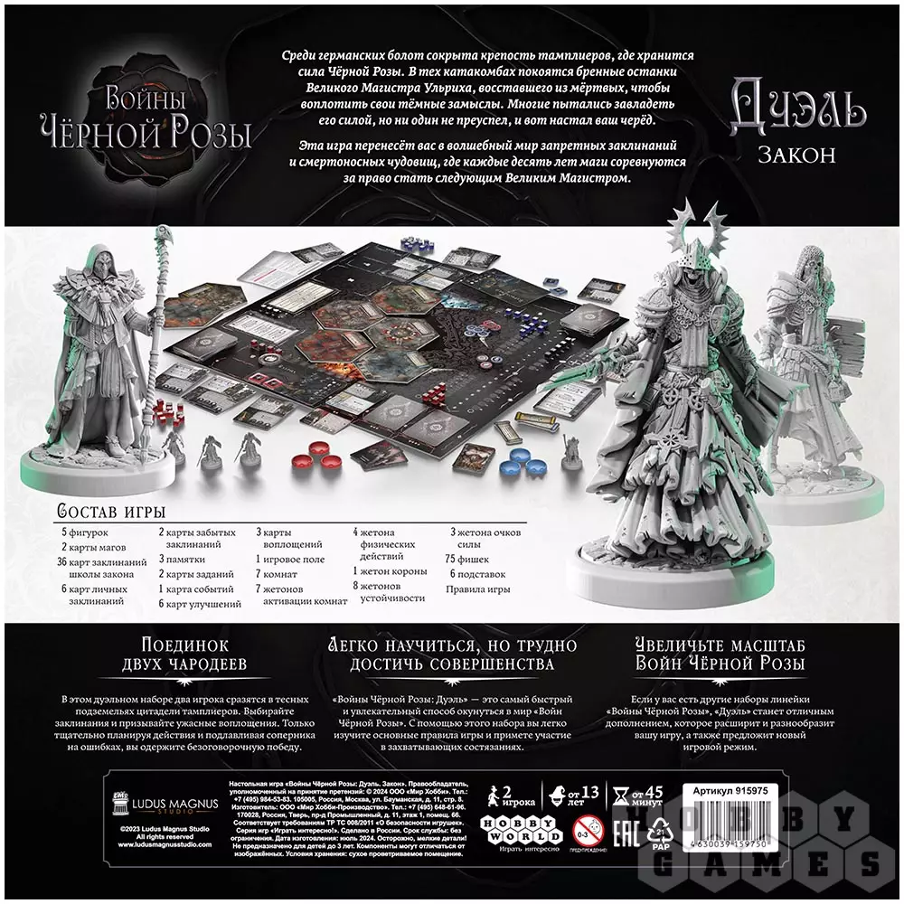 "Войны Чёрной розы: Дуэль. Закон" – это настольная игра в жанре фэнтези, благодаря которой вы окажетесь в мире, полном опасных, местами смертоносных заклинаний и ужасающих монстров. Вы столкнётесь в поединке один на один друг с другом за право стать Великим Магистром и единоличное владение древней силой, обуздать которую сможет лишь избранный. Используйте свои лучшие заклятия, просчитывайте шаги на несколько ходов вперёд, старайтесь выбить соперника из колеи и заставить ошибиться, и тогда вы сможете хотя бы приблизиться к победе... если не завладеть ею окончательно.