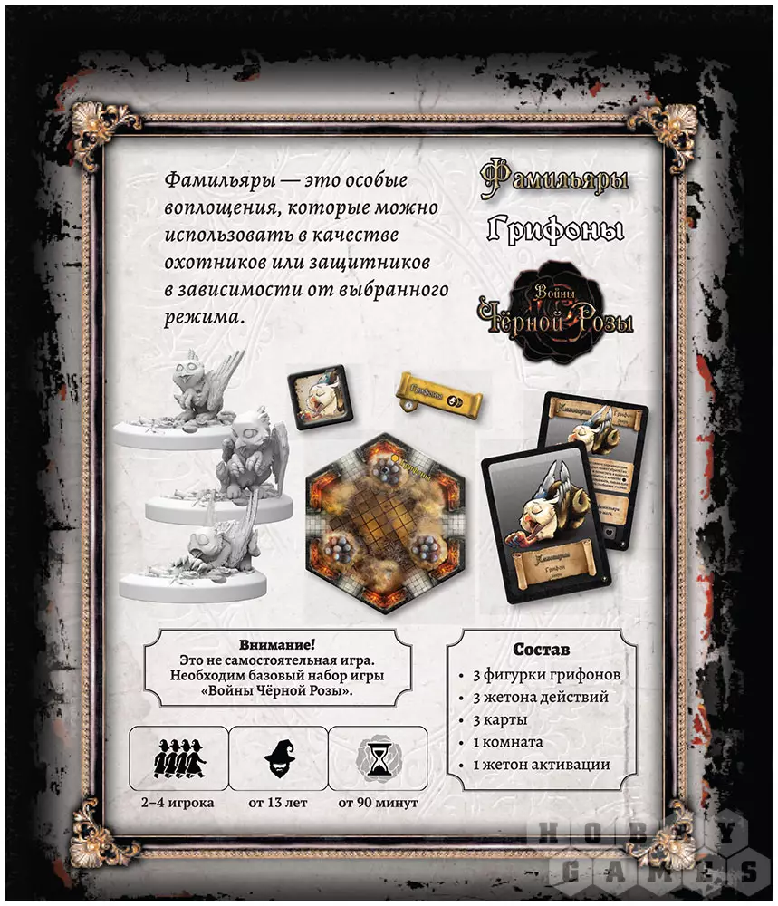 "Войны Чёрной Розы. Фамильяры: Грифоны" пополняет список призываемых воплощений тремя гордыми, но преданными существами – грифонами: Клювокрыл, Полли и Лирой. Это фамильяры, которые отличаются от обычных воплощений тем, что маг может использовать их двумя разными способами, в зависимости от выбранного им режима: фамильяр используется в режиме защитника, когда находится в одной комнате вместе со своим призывателем – находясь в этом режиме, фамильяр не может стать отдельной целью. Однако когда маг получает урон, он может распределить его полностью между собой и фамильяром как угодно. В режим охотника фамильяр переходит в момент, когда остаётся в комнате без мага, который его призвал. Будучи охотником, фамильяр подчиняется обычным правилам воплощения: он может становится целью и получает весь урон. Но когда маг получает урон больше, чем у него осталось здоровья, он обязан адресовать излишки урона своему фамильяру, даже если тот находится в режиме охотника.