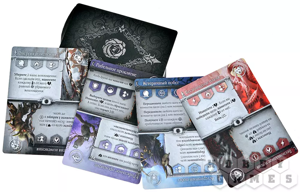 Завершает раунд последний этап – очистка, во время которого сбрасываются разыгранные заклинания, обновляются жетоны на поле и проверяется стабильность комнат. Если во время этого этапа один из магов (или Чёрная Роза) набирает достаточно очков силы для победы, игра заканчивается.