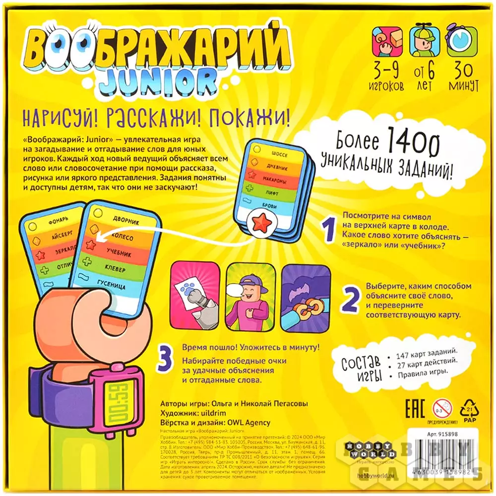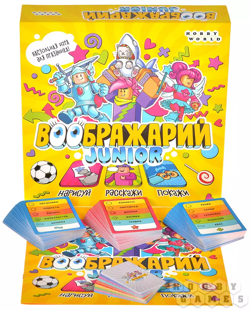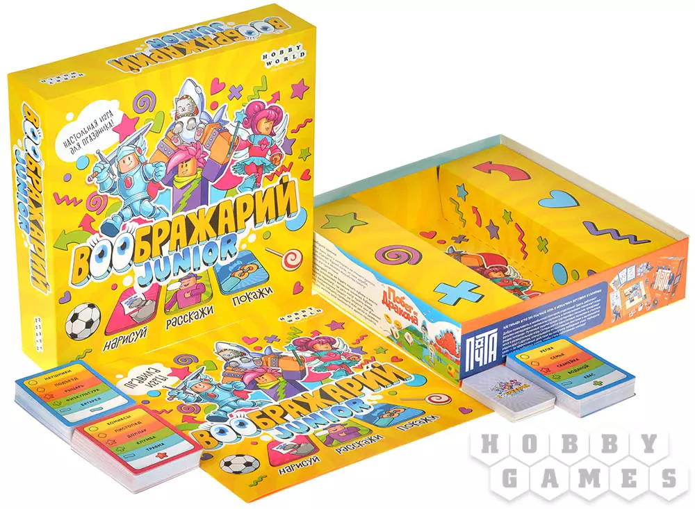 "Воображарий Junior" – это новый представитель в отличной серии настольных игр, построенных на ассоциациях. На этот раз игра была разработана специально для детей от шести лет и старше. Это отражается в адаптированных правилах, дизайне и, конечно, более подходящем наборе слов на карточках. Не бойтесь, что слова станут слишком простыми – игра предлагает два уровня сложности, где среди простых заданий вы встретите слова тип "мультфильм", "детский сад" или "микроб", а среди сложных "гордость" или "блокада".
