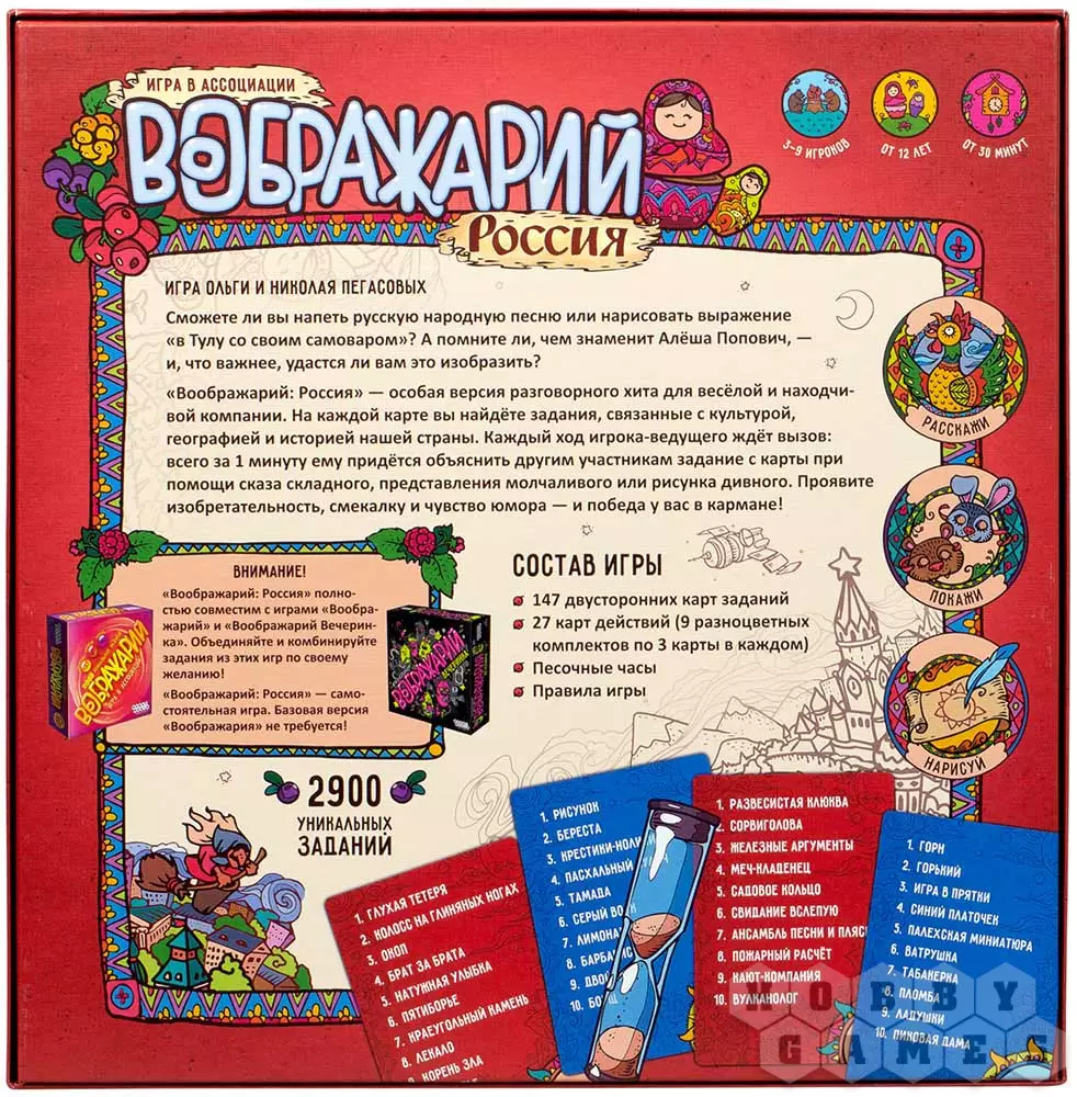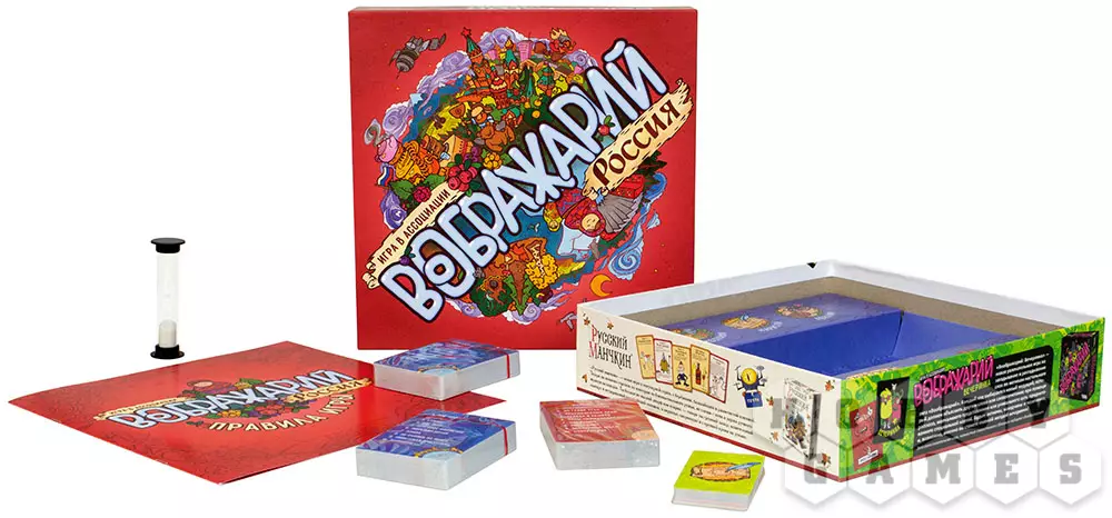 "Воображарий: Россия" – это новая версия хита от мира настольных игр для вечеринок, посвящённая нашей необъятной стране. Проверьте свои знания истории, географии и культуры матушки-России. А помните ли вы все поговорки, песни, былины и сказки? Сможете за одну минуту объяснить задание другим молодцам и девушкам при помощи слов, жестов или рисунков? Есть отличная возможность это узнать и проверить, кто самый умный и премудрый удалец!