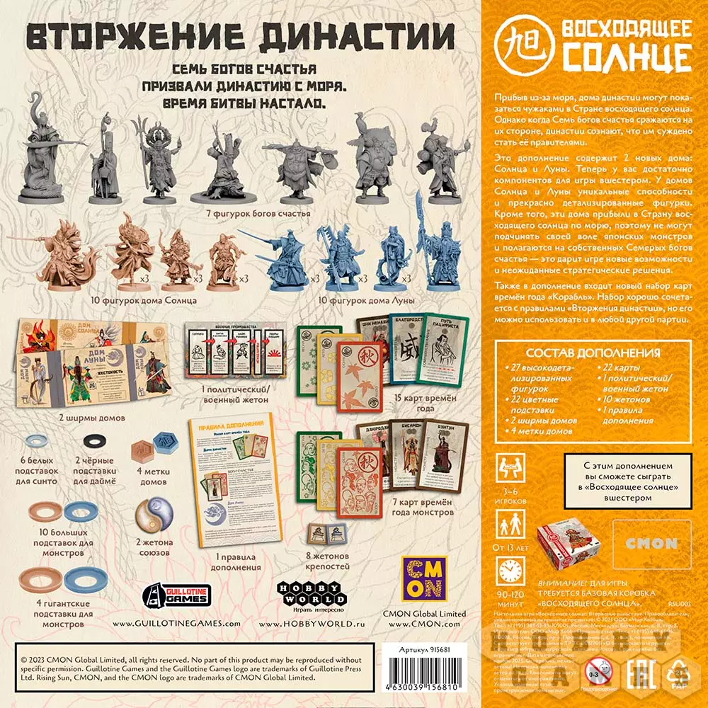 "Вторжение династии" – это свежее дополнение для настольной игры "Восходящее Солнце". Для игры вам, конечно же, потребуется базовая версия, но играть можно и с несколькими дополнениями сразу. Данное расширение сильно освежает игровой процесс, добавляет много новых возможностей и интересных механик.