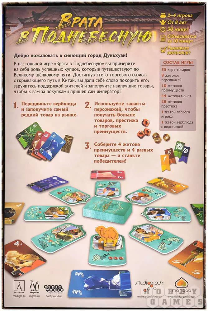 "Врата в Поднебесную" – карточная экономическая стратегия, в которой вы возьмёте роли предприимчивых торговцев. Пополняя прилавок экзотическими товарами, планируя действия и предугадывая шаги оппонентов вы будете приближаться к господству над Дуньхуаном!