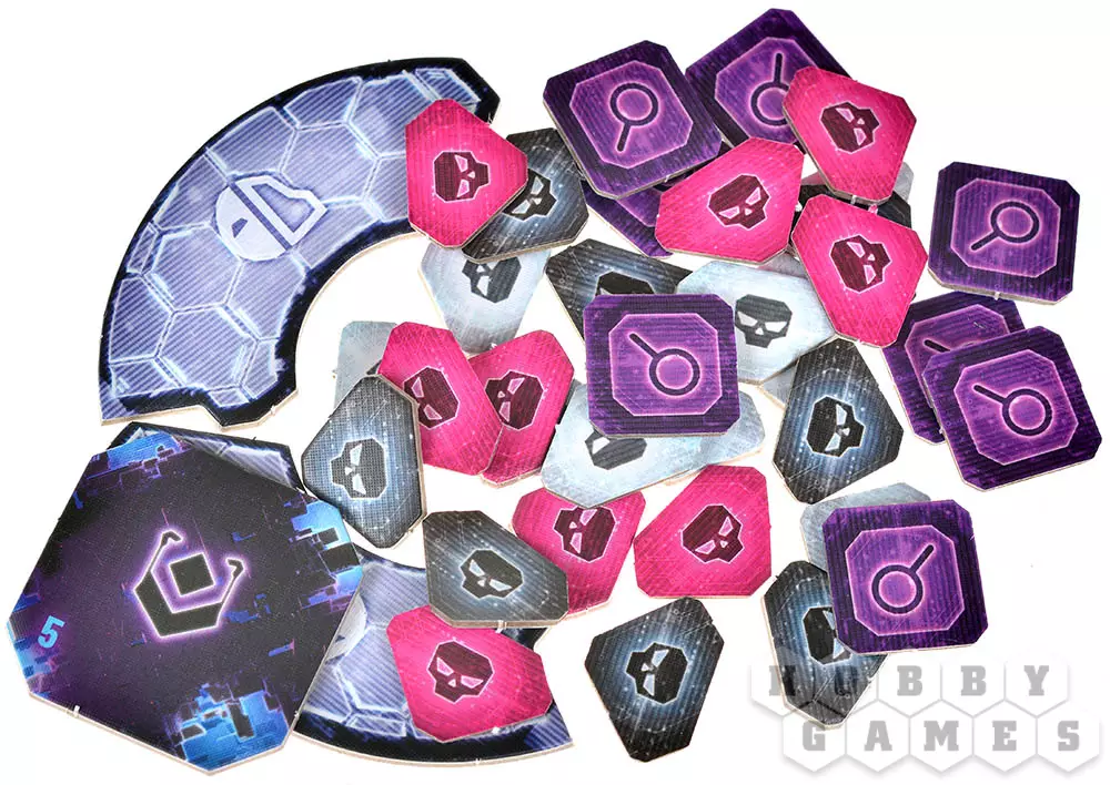 Уделим особое внимание фазе действий, так как это основная часть вашего хода. Вам доступны следующие варианты: перемещение с потенциальной возможностью раскрыть и активировать новую комнату, атака, экранирование (то есть защита), конфигурация (оптимизация ресурсов), заражение (размещение жетонов вирусов, которых у вас ограниченное количество, в комнатах базы данных; их количество повышает уровень вашей угрозы), выход (отключение аватара от системы), переподключение и улучшение (изменение характеристик с помощью соответствующих фишек и деки). Количество ваших действий ограничено значением кликов в слоте процессора, но тип вы можете выбирать сами.