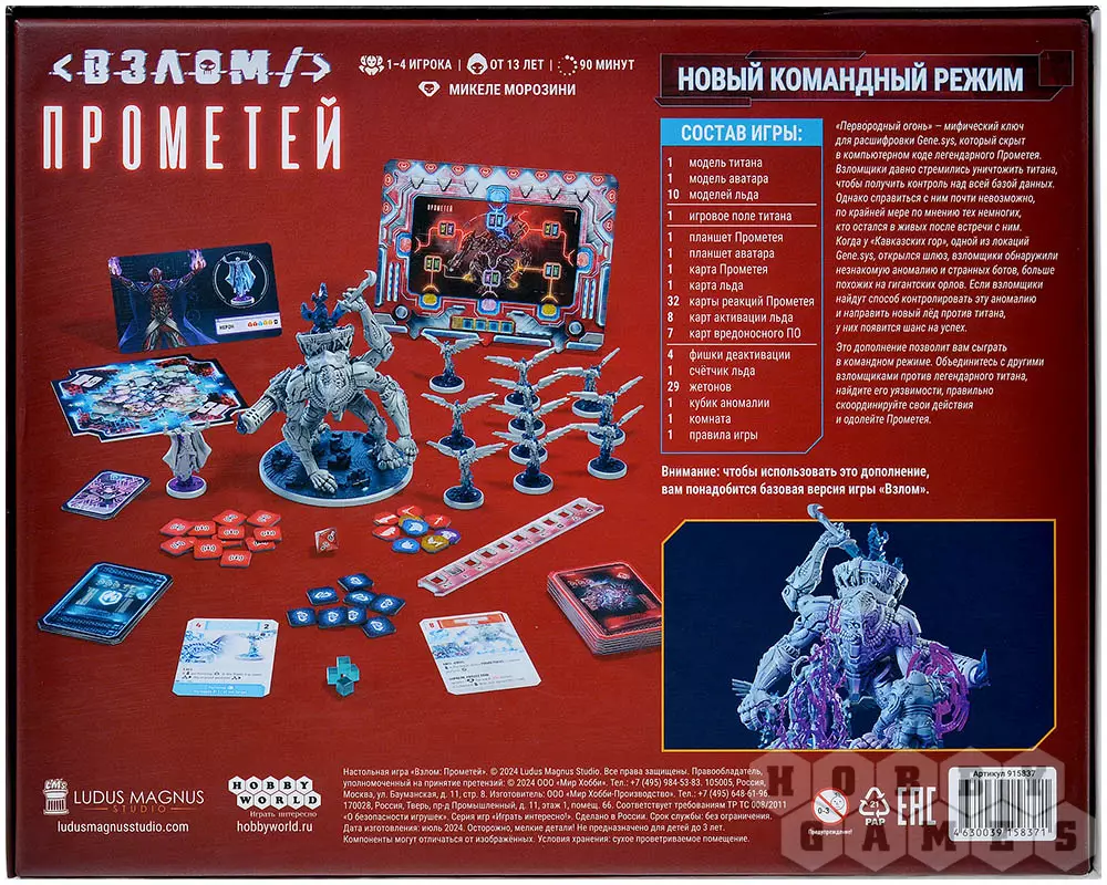 "Взлом: Прометей" – это дополнение, которое совершенно меняет уже ставший привычным соревновательный ход "Взлома" и открывает вам кооперативный режим. Теперь у вас появится возможность и даже необходимость сплотиться со своими друзьями и действовать сообща. Как и в базовой версии, у каждого из вас будет свой детализированный 3D-аватар и карта взломщика. Помимо главного врага Прометея, представленного в виде роскошной фигурки, вам по-прежнему придётся сражаться с более слабыми врагами – его прихвостнями. Однако правильная стратегия и грамотное распределение сил в команде позволят вам с лёгкостью устранить всех, кто окажется на вашем пути к главной цели – "Первородному огню", который хранится в компьютерном коде Прометея и является ключом к расшифровке базы данных. Скорее объединитесь с союзниками и доведите свою миссию до конца!