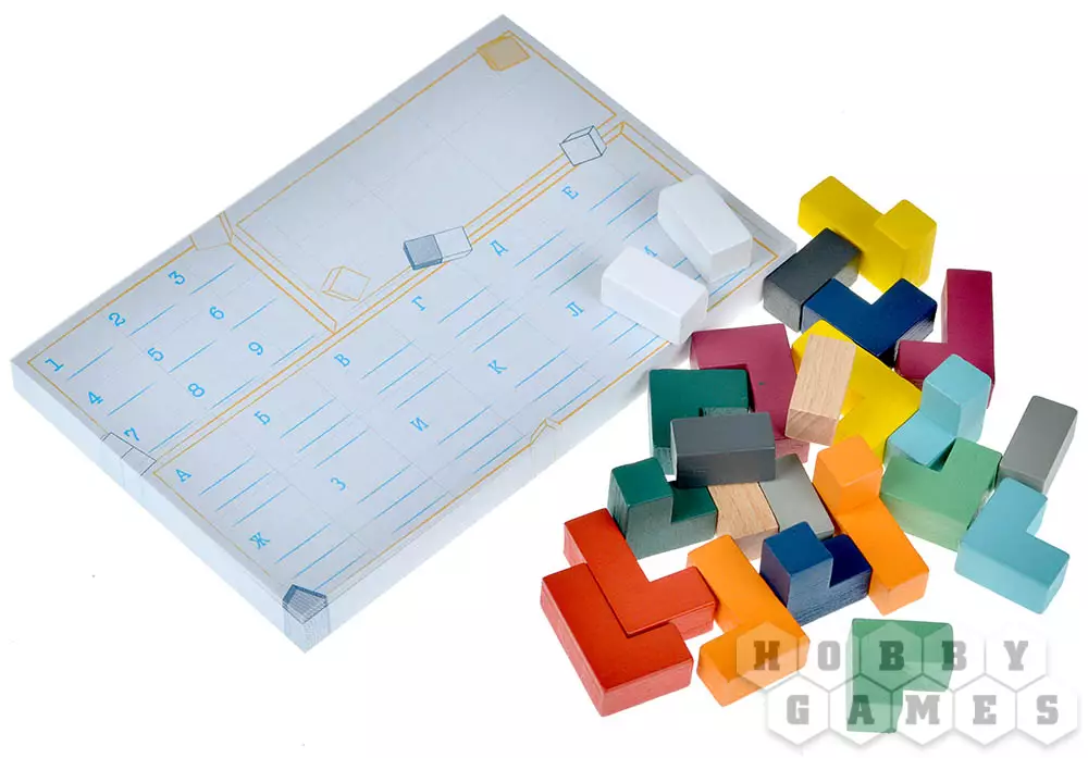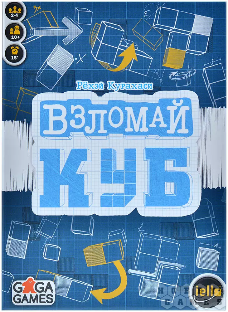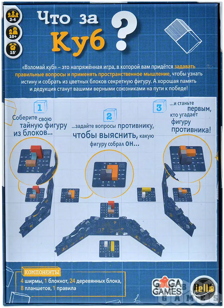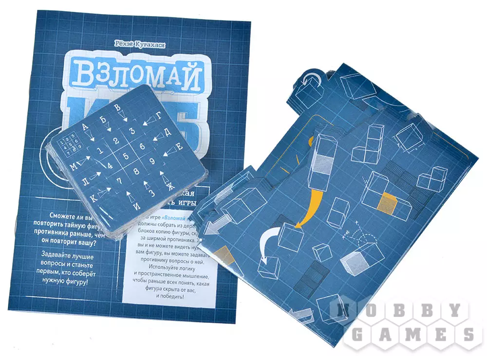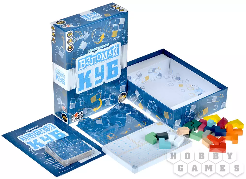 "Взломай Куб" – захватывающая головоломка, которая развивает дедуктивные навыки и пространственное мышление. Она является идейным продолжением игры "Взломай код". Чтобы выиграть, нужно быстрее всех делать выводы из доступной информации. Догадайтесь, как именно выложены трёхмерные блоки соперника. Подглядывать нельзя! Выложенные фигурки надёжно скрыты за ширмой! Поочерёдно спрашивайте друг друга о цветах фигурок и их положении. Будьте начеку – любой необдуманный вопрос или бесполезное действие приближают соперника к победе! Настолка легка в понимании для всех, кто играл в морской бой, веет духом судоку и будет интересна для тех, кто ещё не знаком с миром настольных игр.