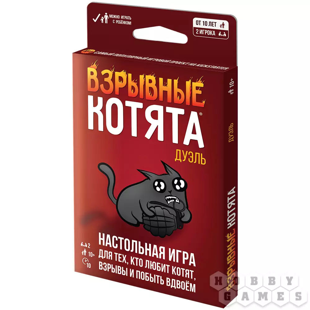 "Взрывные котята: Дуэль" – это новая версия мирового хита, что позволит взглянуть на игру с совершенно новой стороны. Если классические "Взрывные котята" играются тем веселее, чем больше людей, то в "Дуэль", как можно догадаться, могут играть лишь двое. Но, поверьте, накал страстей от этого лишь возрастёт! Грядёт настоящая битва (кошачьих) умов, где каждый ход может стать решающим, а от каждой карты может нешуточно пригореть. От злости и обиды.