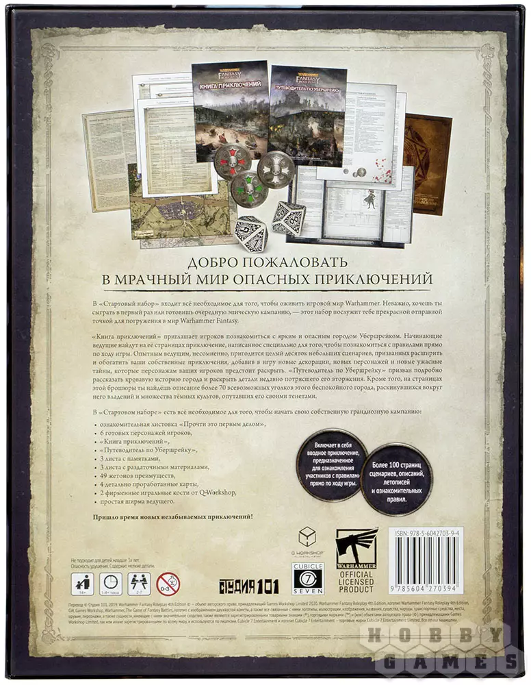 Стартовый набор позволит с удовольствием познакомиться с ролевыми играми и вселенной Warhammer, не обременяя себя утомительной подготовкой. Он создан специально с расчётом на новых игроков и содержит одиннадцать последовательных сценариев, что шаг за шагом расскажут вам правила и особенности мира Warhammer. Вы в увлекательном формате узнаете всё необходимое: что из себя представляет игра, как создавать персонажей и взаимодействовать с игровым миром, как работает боевая система и многое другое. А для того, чтобы сделать игровой процесс ещё комфортнее, в состав набора входит множество аксессуаров: брошюры, бланки с подсказками, жетоны, городские карты, стилизованные игральные кости... Вперёд, Старый Свет ждёт вас!