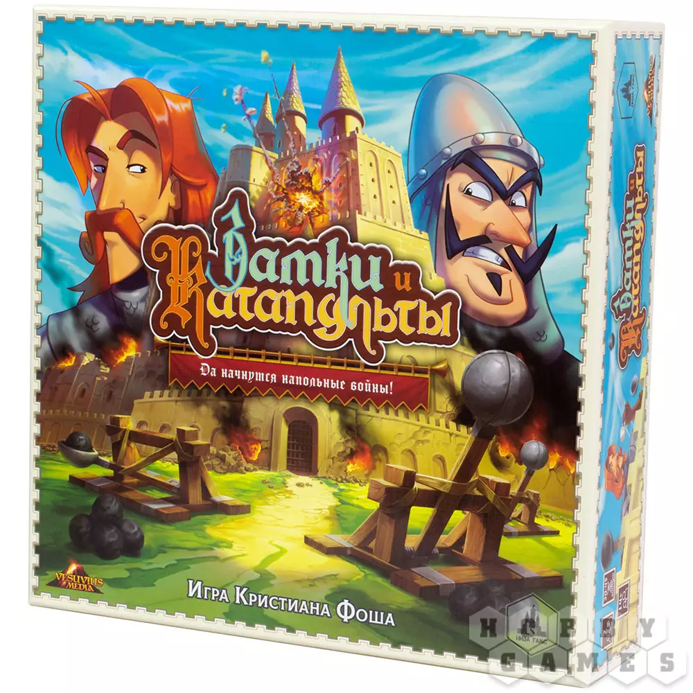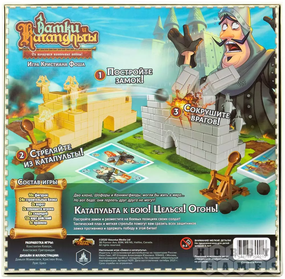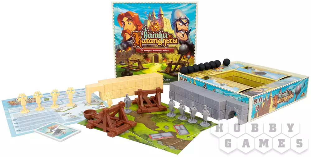 "Замки и Катапульты" – это семейная интерактивная игра, в которой двум игрокам предстоит возвести укрепления из строительных блоков, расставить по ним фигурки своих солдат и начать катапультную артподготовку (контемпорари арт тут ни при чём!) перед наступлением. Они будут расстреливать замки друг друга и разыгрывать карты действий, ремонтируя укрепления, производя залпы, воруя эти карты друг у друга и склоняя солдат противника к предательству. Выиграет тот, кто выведет из строя всю армию противника.
