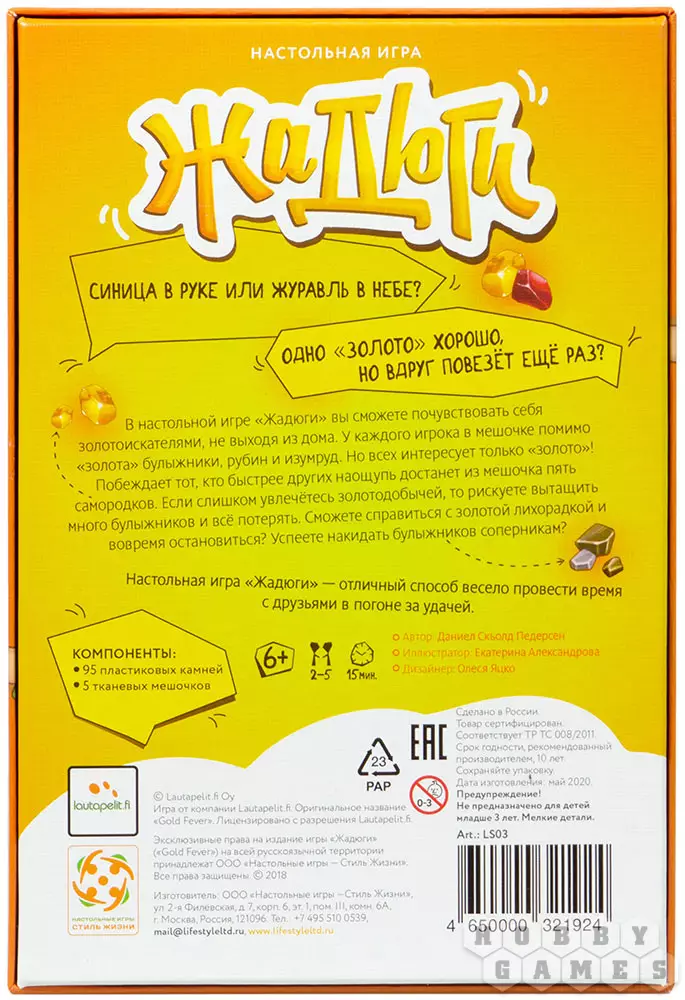 Small Ant11.08.2021 00:16Настольная игра до безобразия гениальна, проста, азартна и интересна, увлекает и все игроки увлечены. Как филер прекрасен, быстро, ярко, легко, весело. Только один минус, довольно значимый - качество мешочков. Правда, тут прям косяк... Ну вот в них есть белая подкладка - она порвется первой, и может образоваться второе дно, где у вас будет то самое победное золото... Мы дома обрезали эту бесполезную мишуру, прошлись машинкой по краям, чтобы он был прочнее, перевезяла завязки и прошлись огоньком по краям. В общем сделали мешочки такими, какими ими бы, по-хорошему, изначально надо быть. -