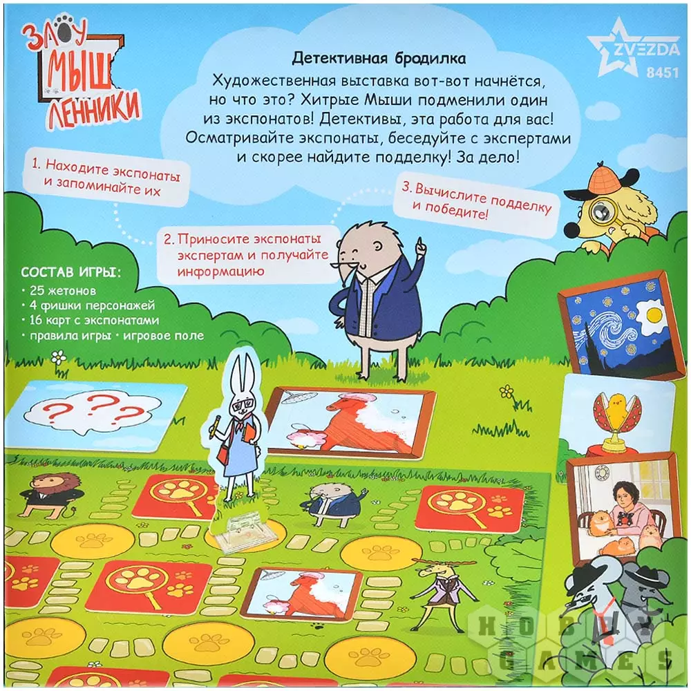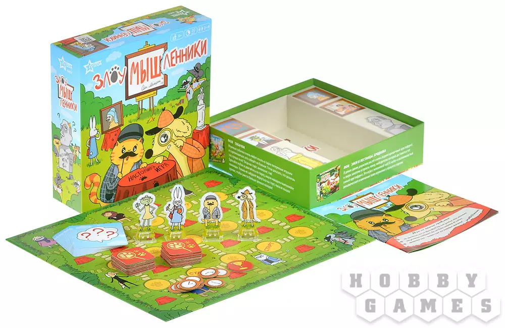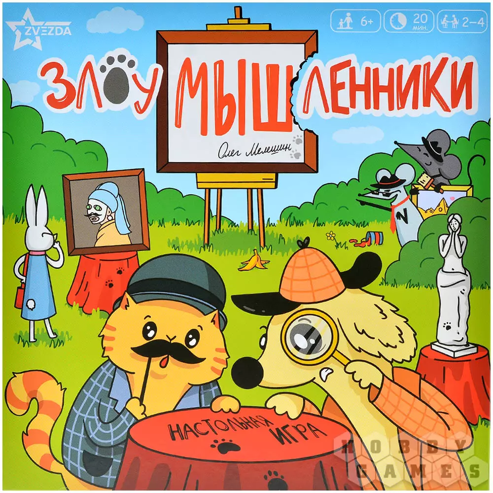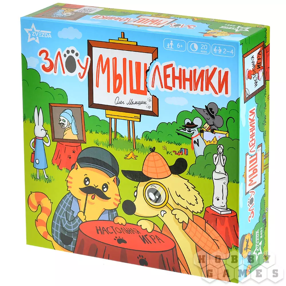"ЗлоуМЫШленники" – кооперативная игра для 2-4 детективов, где главная задача – найти поддельный экспонат, пока не истекло время. Игроки перемещают своих персонажей по залам галереи, осматривают лежащие на столах экспонаты и запоминают их расположение. Уникальность игры заключается в гармоничном сочетании механик запоминания, дедукции и логического планирования, где важна каждая подсказка. Яркое игровое поле, стилизованные жетоны экспонатов и забавные персонажи-детективы создают неповторимую атмосферу творческого хаоса и веселья. Каждая партия уникальна, ведь карты информации и подделки меняются местами, и вам снова и снова придётся проявлять смекалку!