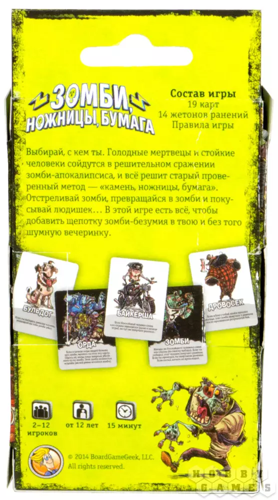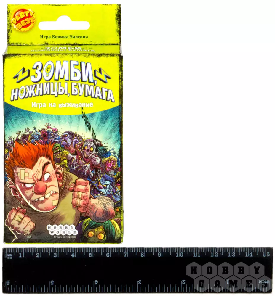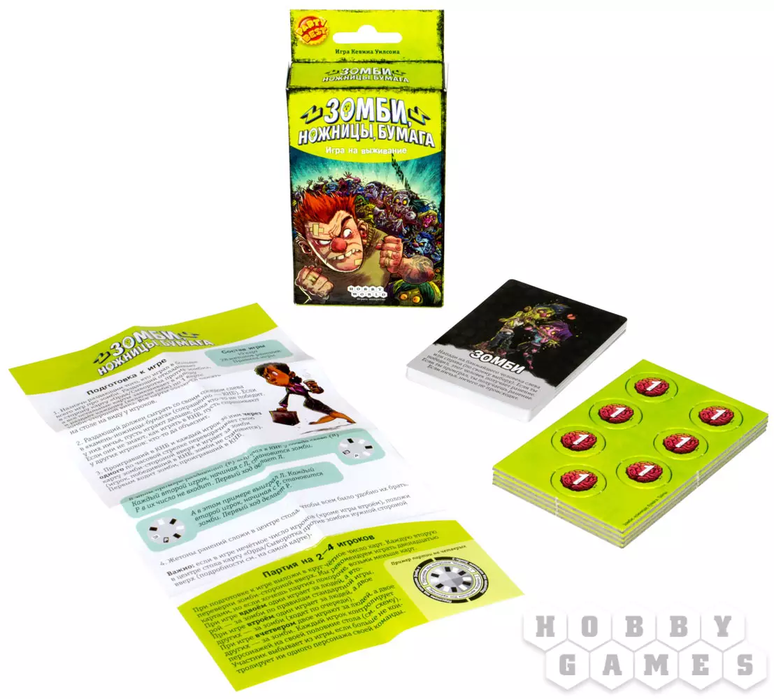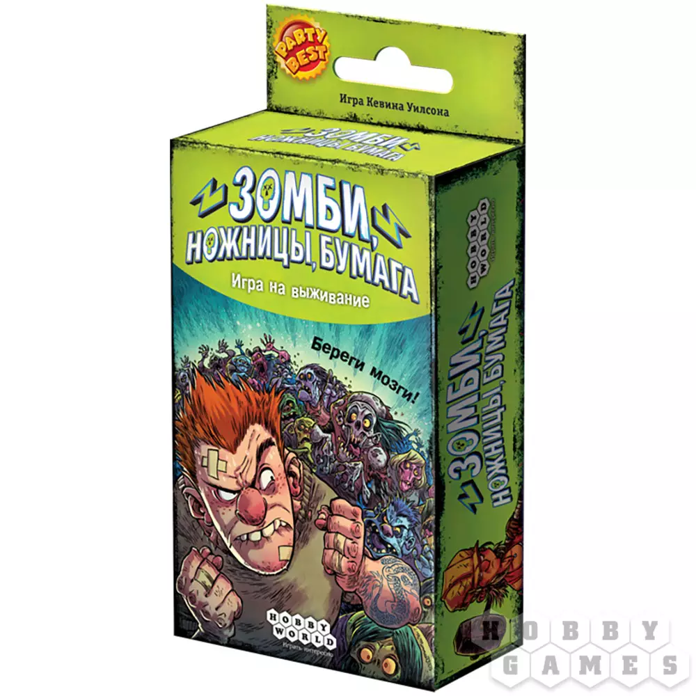 "Зомби, ножницы, бумага" – это весёлая и компактная настольная игра для большой компании до двенадцати человек. Простые правила, брутальные иллюстрации, никаких кубиков и многими любимая тема зомби-апокалипсиса делают эту игру идеальным дополнением любой молодёжной вечеринки!