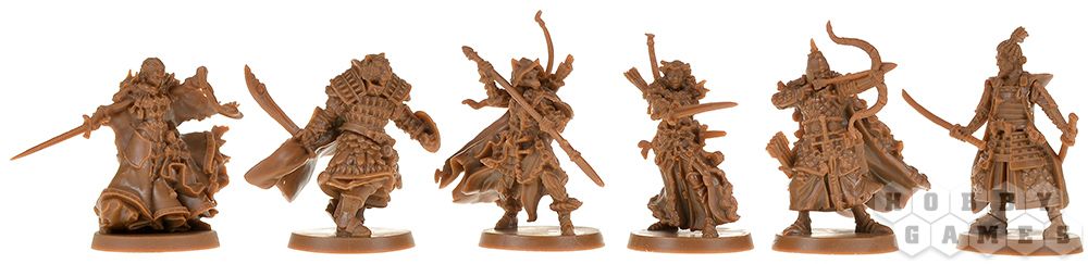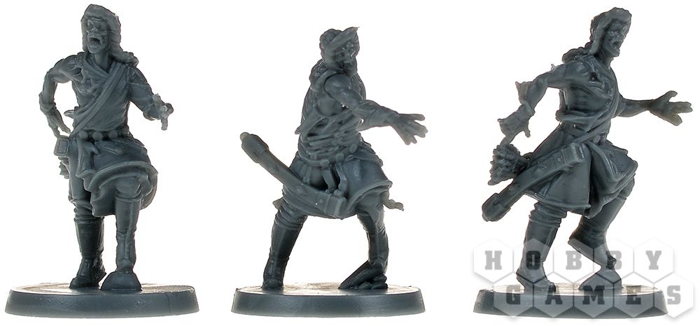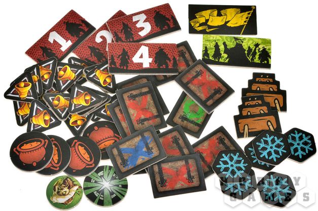 Фаза игроков – вы получаете три действия на персонажа (на старте). Двигайтесь по зонам, преодолевая стены и лестницы, но будьте осторожны – за выход из зоны с зомби придётся заплатить дополнительными действиями. Обыскивайте здания (только там, где нет врагов), чтобы находить новое оружие – от кинжалов до древковых алебард, позволяющих бить врагов издалека. Меняйтесь снаряжением с союзниками, активируйте цели или отдавайте приказы страже – эти бесстрашные бойцы могут атаковать, двигаться и даже опрокидывать котлы с кипящей смолой на орды нежити.