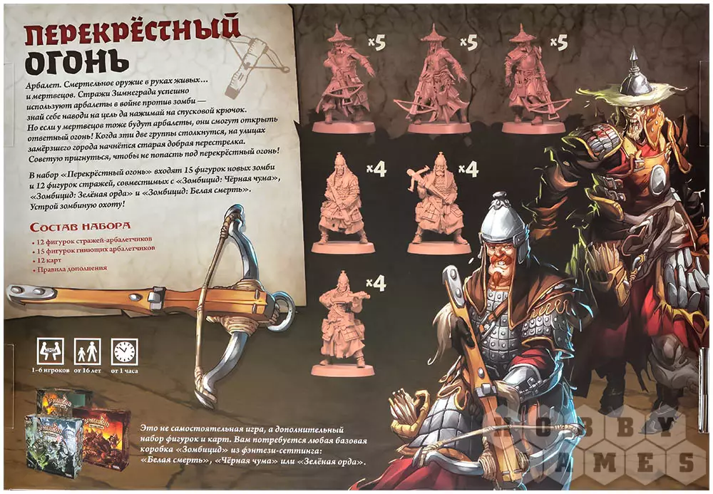 Дополнение "Зомбицид: Белая смерть. Перекрёстный огонь" выводит игру на принципиально новый уровень тактического напряжения. В ваш арсенал поступают 12 фигурок элитных стражей с арбалетами – беспощадных профессионалов дальнего боя. Но 15 новых зомби-арбалетчиков мгновенно нивелируют это преимущество, превращая каждую миссию в напряжённую огневую дуэль.