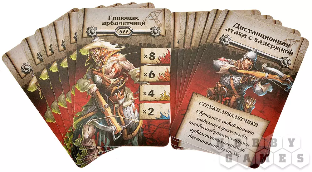 Фаза игроков – вы получаете три действия на персонажа (на старте). Двигайтесь по зонам, преодолевая стены и лестницы, но будьте осторожны – за выход из зоны с зомби придётся заплатить дополнительными действиями. Обыскивайте здания (только там, где нет врагов), чтобы находить новое оружие – от кинжалов до древковых алебард, позволяющих бить врагов издалека. Меняйтесь снаряжением с союзниками, активируйте цели или отдавайте приказы страже – эти бесстрашные бойцы могут атаковать, двигаться и даже опрокидывать котлы с кипящей смолой на орды нежити.