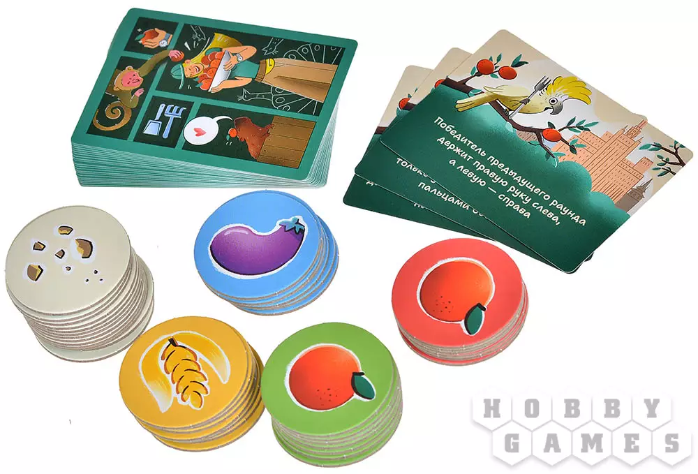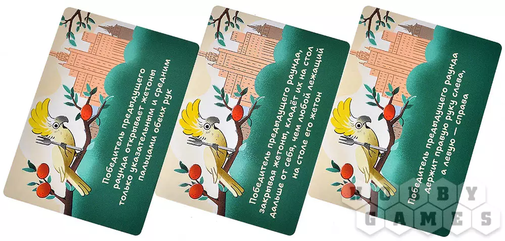 Иногда в игровой процесс вмешивается озорной какаду. Этот нахальный птиц любит отвлекать смотрителей и усложнять им задачу. Победителю раунда, в котором появляется карта какаду, придется выполнять особые условия, указанные на карте. Например, ему может потребоваться отодвигать жетоны подальше от себя или открывать их только двумя пальцами. Если вы хотите добавить игре больше азарта и усложнить процесс, обязательно включайте карты какаду в колоду.