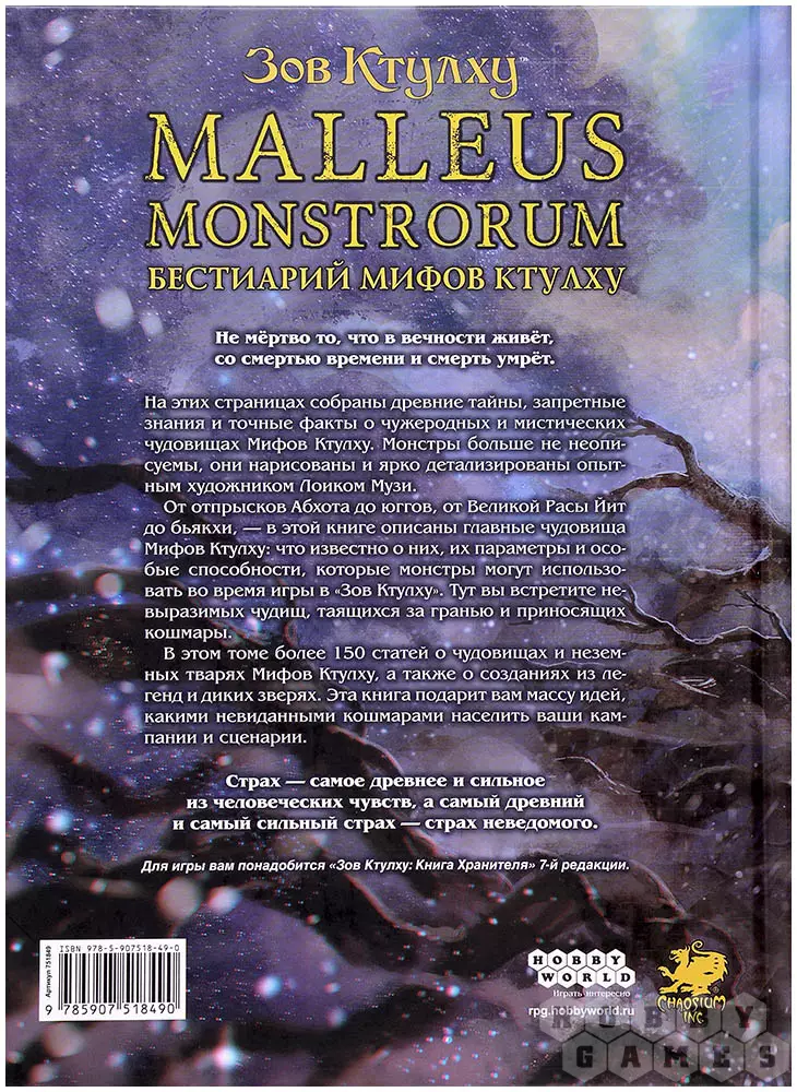 На страницах этого тома вы столкнётесь лицом к лицу с мраком и ужасом. Воображение не всегда может справиться со всеми сценами мира Лавкрафта. Мифы Ктулху, тайны древних монстров, выходящие за пределы понимания смертных, оживают на страницах бестиария. От ужасов Абхота до юггов, от таинственной Расы Йит до бьякхи, книга оживляет всех существ, которые только в самых страшных кошмарах могут присниться.