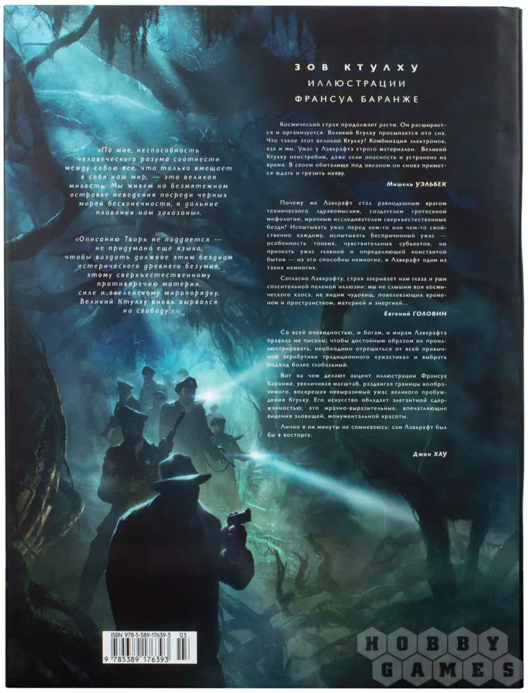 Chill16.02.2022 23:37Картины Франсуа Баранже идеально синтезируются с текстом произведений Говарда Филлипса Лавкрафта. Творения французского художника позволяют с головой погрузиться в пугающую, мистическую и, в тоже время, такую манящую атмосферу мрачного мира. Я с удовольствием добавил этот великолепный артбук в свою коллекцию.