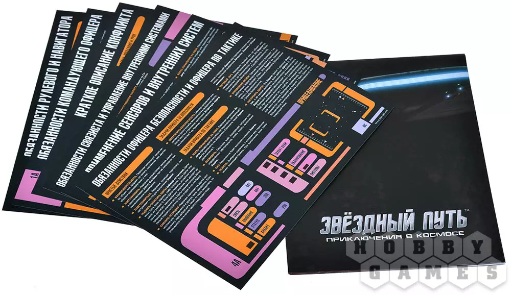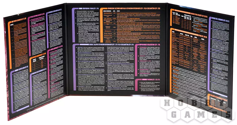 Эта ширма ведущего для настольной ролевой игры "Звёздный путь: Приключения в космосе" содержит на себе множество полезной информации об основных игровых механиках. Она состоит из трёх секций, а выполнена из плетёного картона высокого качества. Ведущему она поможет не только помнить основные правила, но и скрывать броски кубиков от игроков. Также в комплекте с ширмой идёт карта-плакат Альфа- и Бета-квадрантов, покрытый матовой ламинацией, а ещё полезные раздаточные материалы.